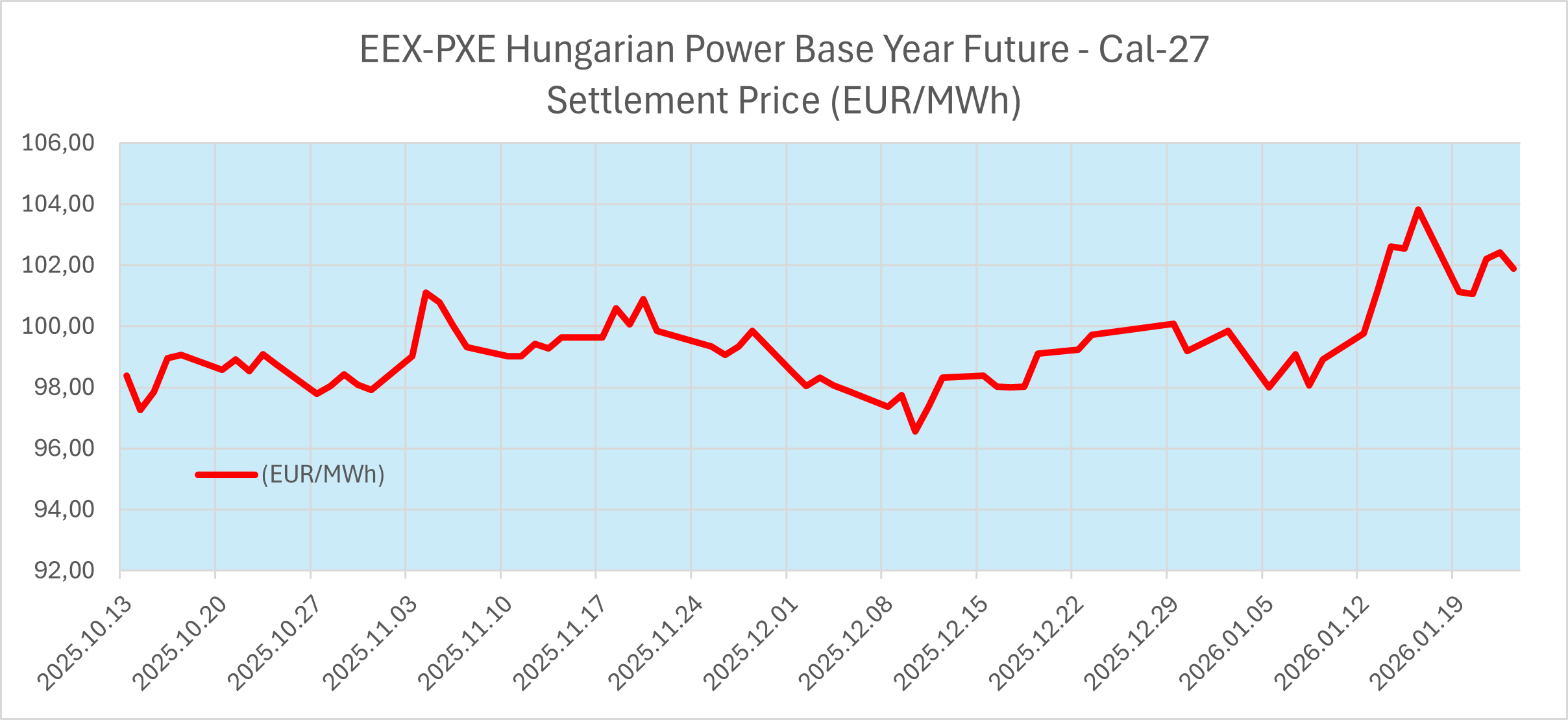 Az alábbi diagram, 2025.10.13-tól kezdődően, hisztorikusan mutatja, hogyan alakult a Magyarországi, 2027 évi szállítási időszakra vonatkozó, zsinór villamos energia napi záróára a német áramtőzsdén.
